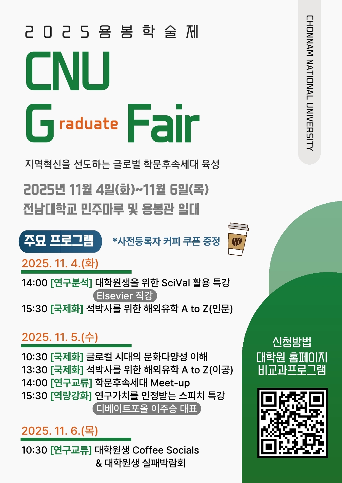 2. 대학 구성원들의 연구 교류 활성화 및 연구 역량 강화를 위하여 붙임과 같이 「2025 용봉학술제 G-Fair 대학원 특별세션」을 운영하오니 많은 구성원들이 참여할 수 있도록 적극 홍보하여 주시기 바랍니다.