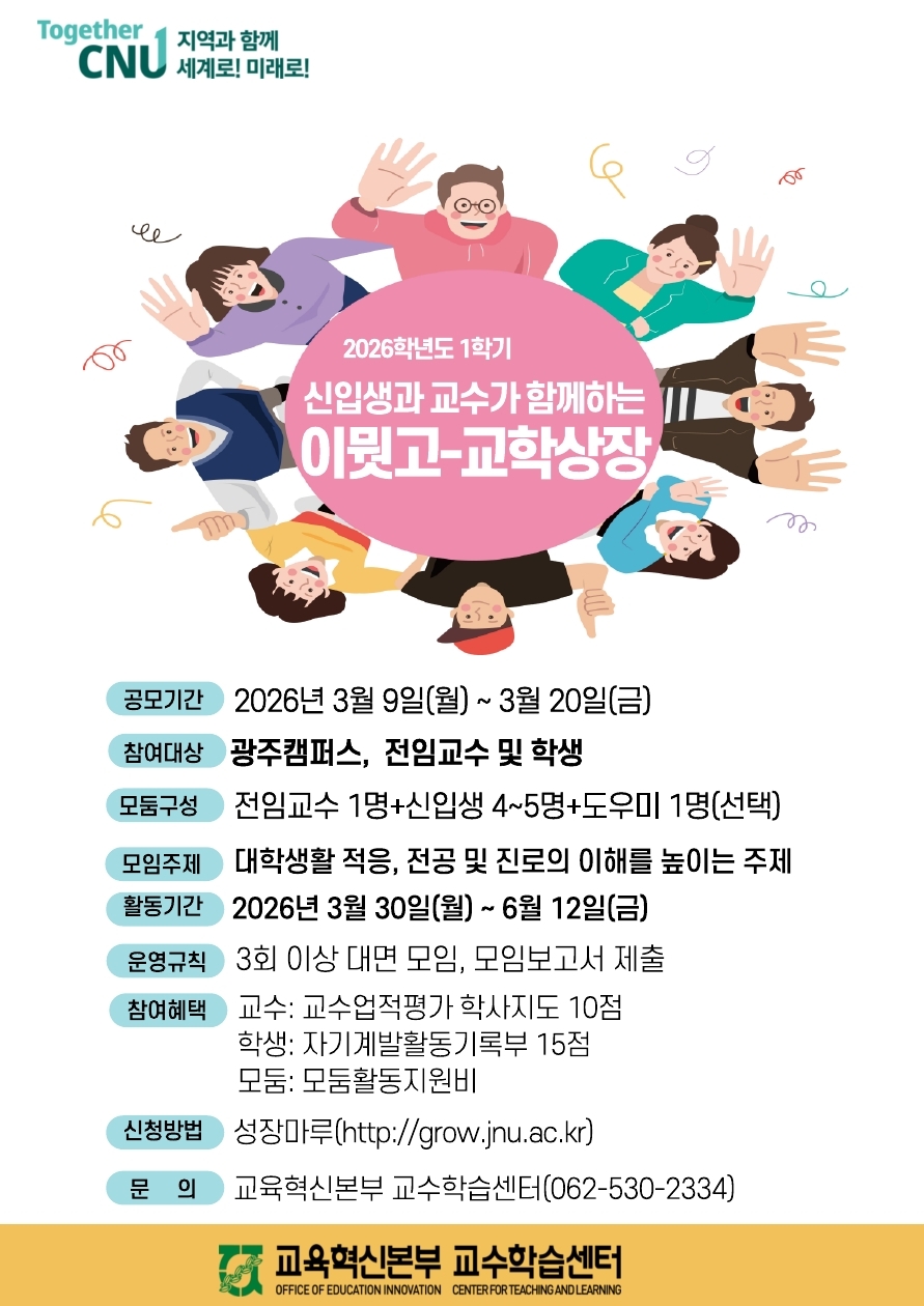 2. 교육혁신본부에서는 신입생의 대학생활 적응력 향상 및 전공과 진로 탐색 기회 제공을 목적으로 운영하는 「이뭣고-교학상장」의 참여 모둠을 공모합니다. 학과(부)의 많은 관심과 참여 바랍니다.