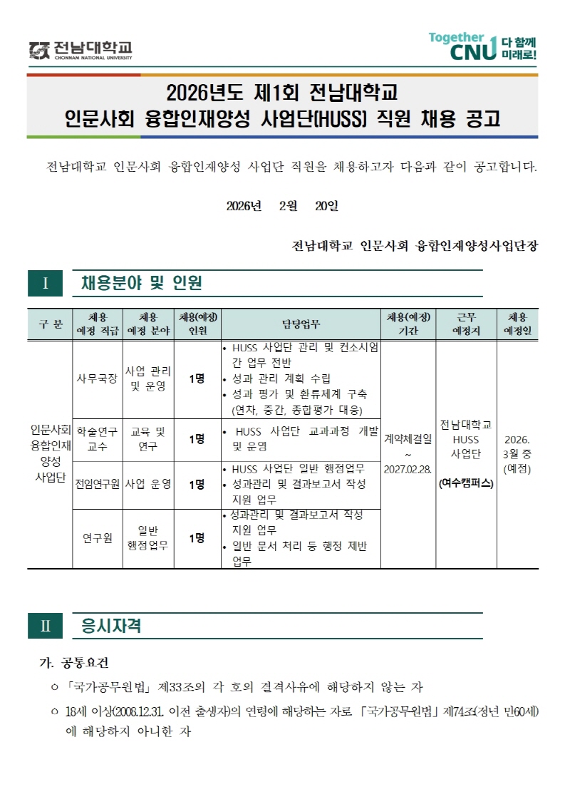 2026년도 제1회 전남대학교 인문사회 융합인재양성사업단(HUSS) 직원 채용 공고
